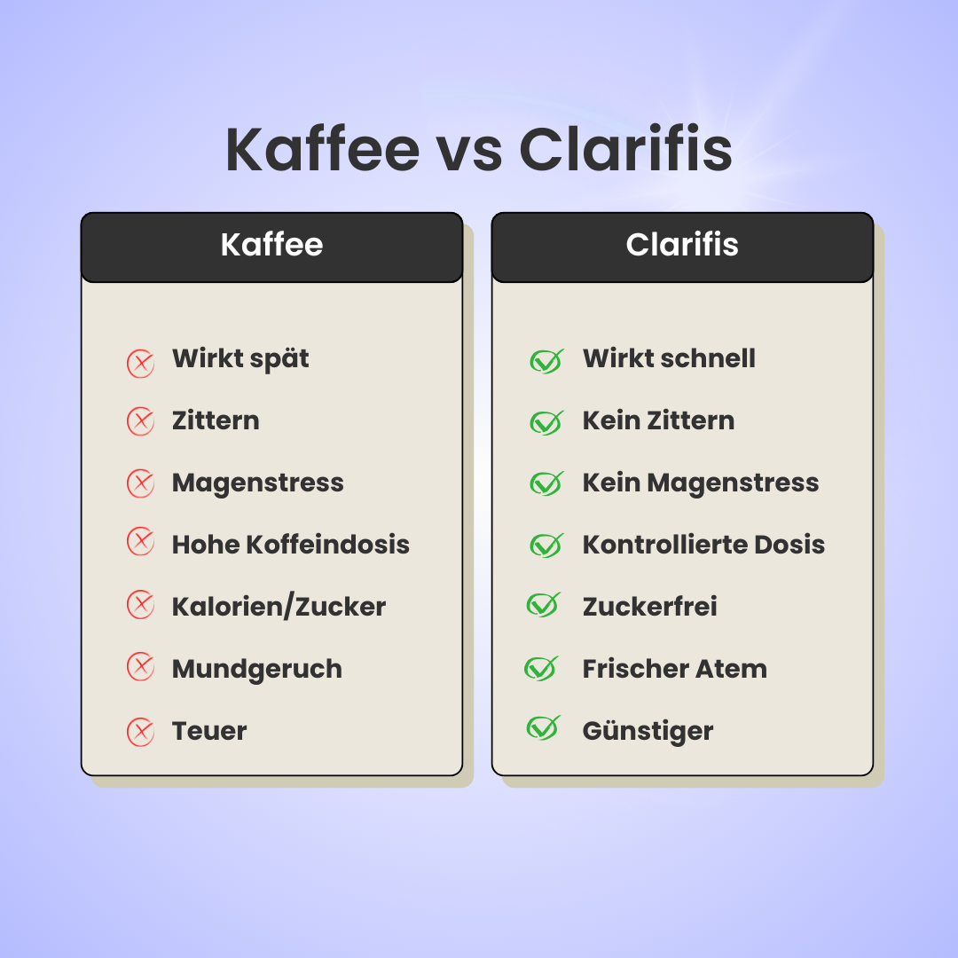 Clarifis wirkt schneller als Kaffee und sorgt in nur wenigen Minuten für klare, gleichmäßige Energie, ohne Crash, ohne Zittern.