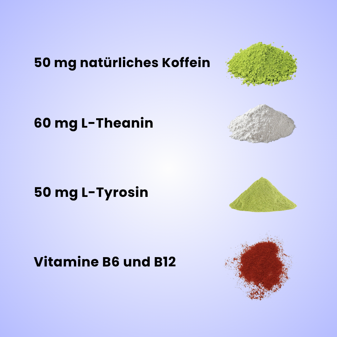 Jedes Stück enthält 50 mg Koffein, 60 mg L-Theanin, L-Tyrosin sowie eine abgestimmte Menge an Vitamin B6 und B12.